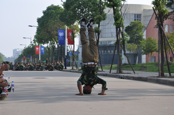 在一个连队的军训休息间隙,学生组织抓紧时机开展慰问活动,一名学生干部为大家献歌一曲,带动了整个队伍的气氛。新生们也不甘示弱,独唱、合唱等多种形式齐上阵,有的同学还即兴搭档起了歌伴舞,多样的表演形式赢得了现场的热烈掌声。拉歌是军训休息时的传统项目,虽然连续几日的训练让同学们都有些疲惫,但拉歌活动的现场始终是激情四射。在教官的带领下,各式各样的拉歌口号此起彼伏,有的连队还饶有兴致的设计了动作。《军中绿花》、《打靶归来》等歌曲你方唱罢我登场,嘹亮的军歌响彻校园。