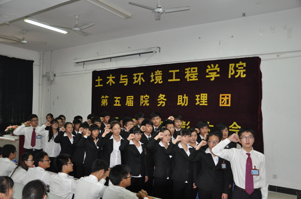 换届大会在13级赵璐同学的主持下拉开帷幕。首先,院务助理团指导老师俞士毛老师发表讲话,他在对过去一年助理团工作做出总结的同时,又对新一届的院务助理团成员提出了殷切期望,并致大会开幕词。随后,计勇院长宣布2012年先进个人和优秀助理名单,并与刘波、罗月颖老师分别为获奖成员颁发荣誉证书。 接下来,俞士毛老师宣读了第五届助理团干部名单,并为其代表颁发聘书。助理团部长以上成员进行了庄严而隆重的就职宣誓仪式,在慷慨激昂的宣誓声中,新一届助理团成员对未来的工作许下了庄严的承诺。新成员代表汪鹏成和新一届干部代表张姣做了表态发言,第四、五 届助理团团长分别对助理团工作进行总结和规划。